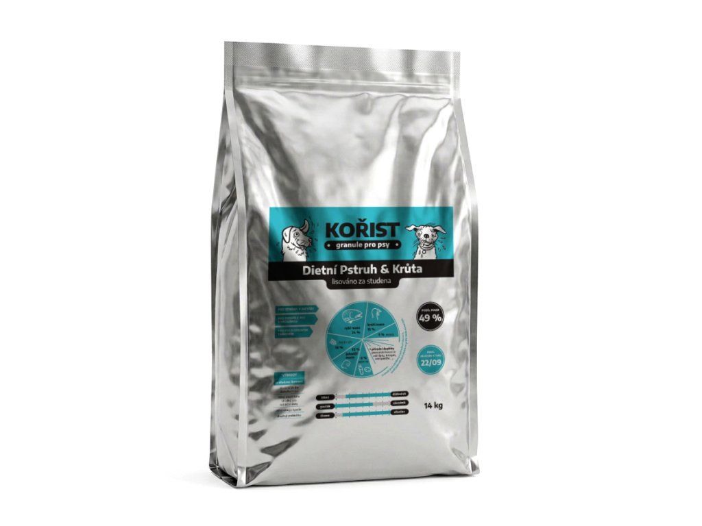 Granule Kořist Dietní Pstruh & Krůta - každá složka v receptuře má svůj smysl – podporuje trávení, klouby, srst, imunitu i celkovou pohodu. Díky šetrnému lisování za studena si zachovávají maximum živin a přirozenou chuť, kterou psi milují: