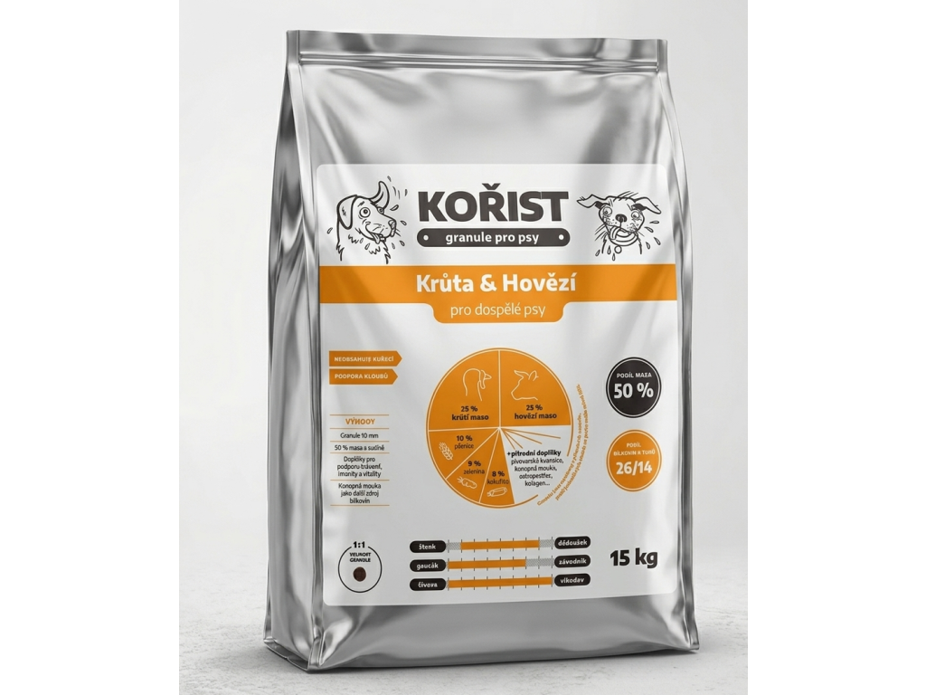 Co v misce zavoní, to v těle pomůže. Granule Kořist – Krůta & Hovězí kombinují kvalitní maso, zeleninu a bylinky pro každodenní výživu, která respektuje přirozené potřeby psa – masožravce.