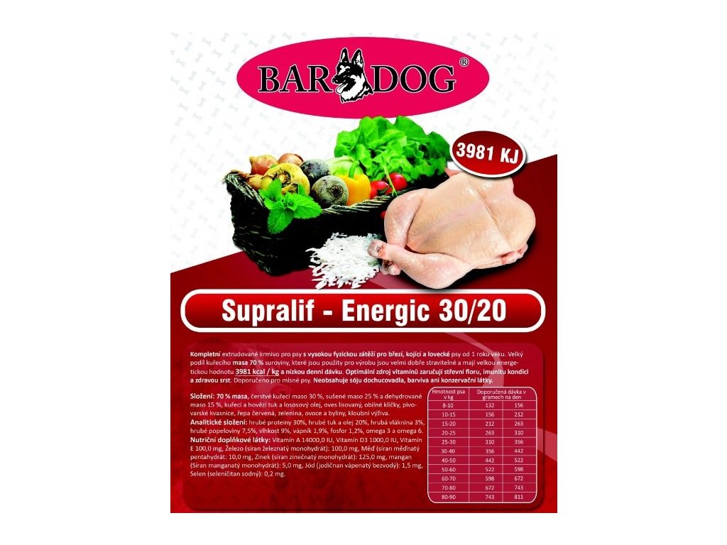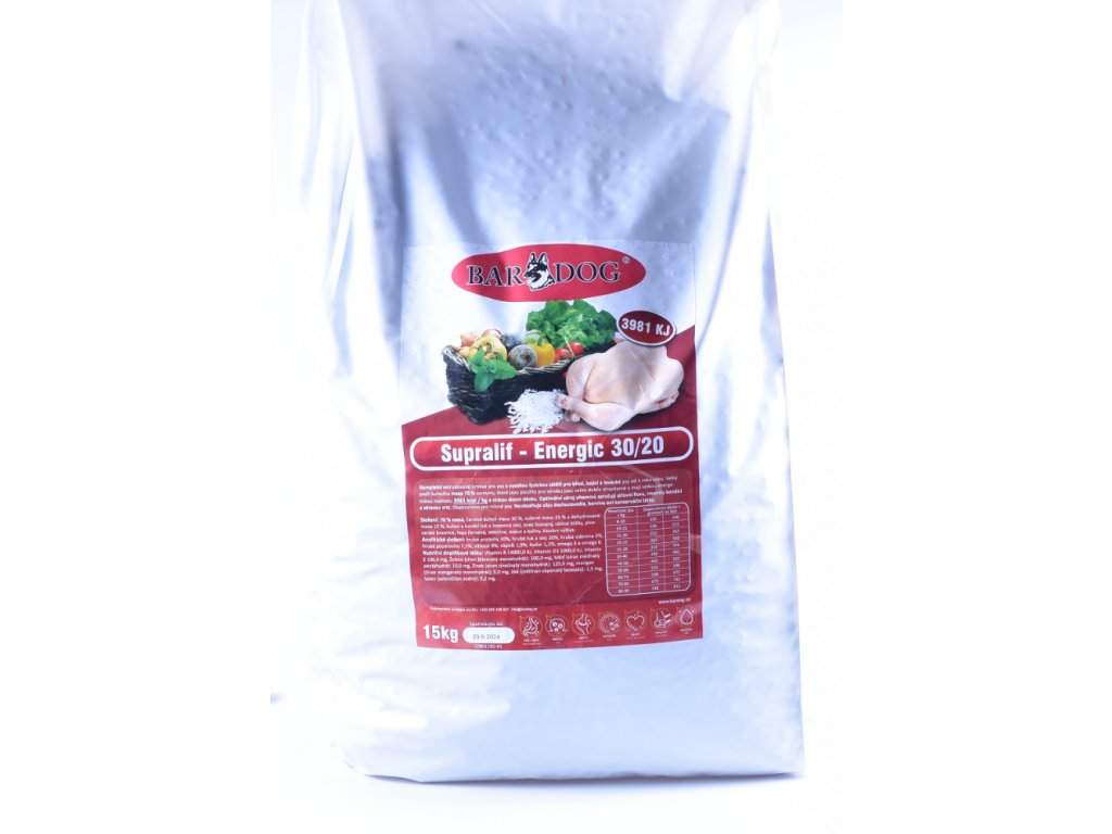 Krmivo BARDOG Supralif - energic 30/20 – speciálně vyvinuté pro dospělé aktivní psy, březí a kojící feny, služební psy všech ras a pro psy ve vysoké fyzické i psychické zátěži.